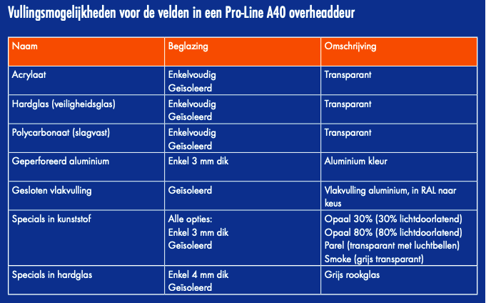 Om uw overheaddeur een individuele styling te geven, kunt u transparante en gesloten vullingen in diverse uitvoeringen combineren. Een overzicht van alle variatiemogelijkheden vindt u in het schema op pagina 11. U kunt eindeloos variëren. De secties van het A40 model worden standaard geproduceerd van geanodiseerd aluminium (E6EV1).
